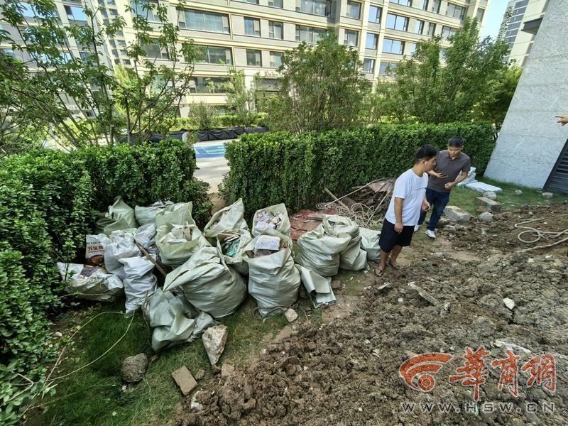 业主们首先带记者来到了11号楼北侧西段绿化带,里面靠近楼体的地基被挖开了一条土沟,中间是一长溜土堆,外面是很多建筑垃圾等杂物,有一部分已经装进了很多编织袋。